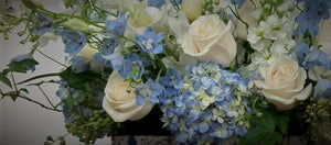 1. Choose Size: Small, Medium, Large, Deluxe or Luxury (Size shown in the first image is an example of a large bouquet) 2. Color is Florist's Choice of white and blue OR enter...