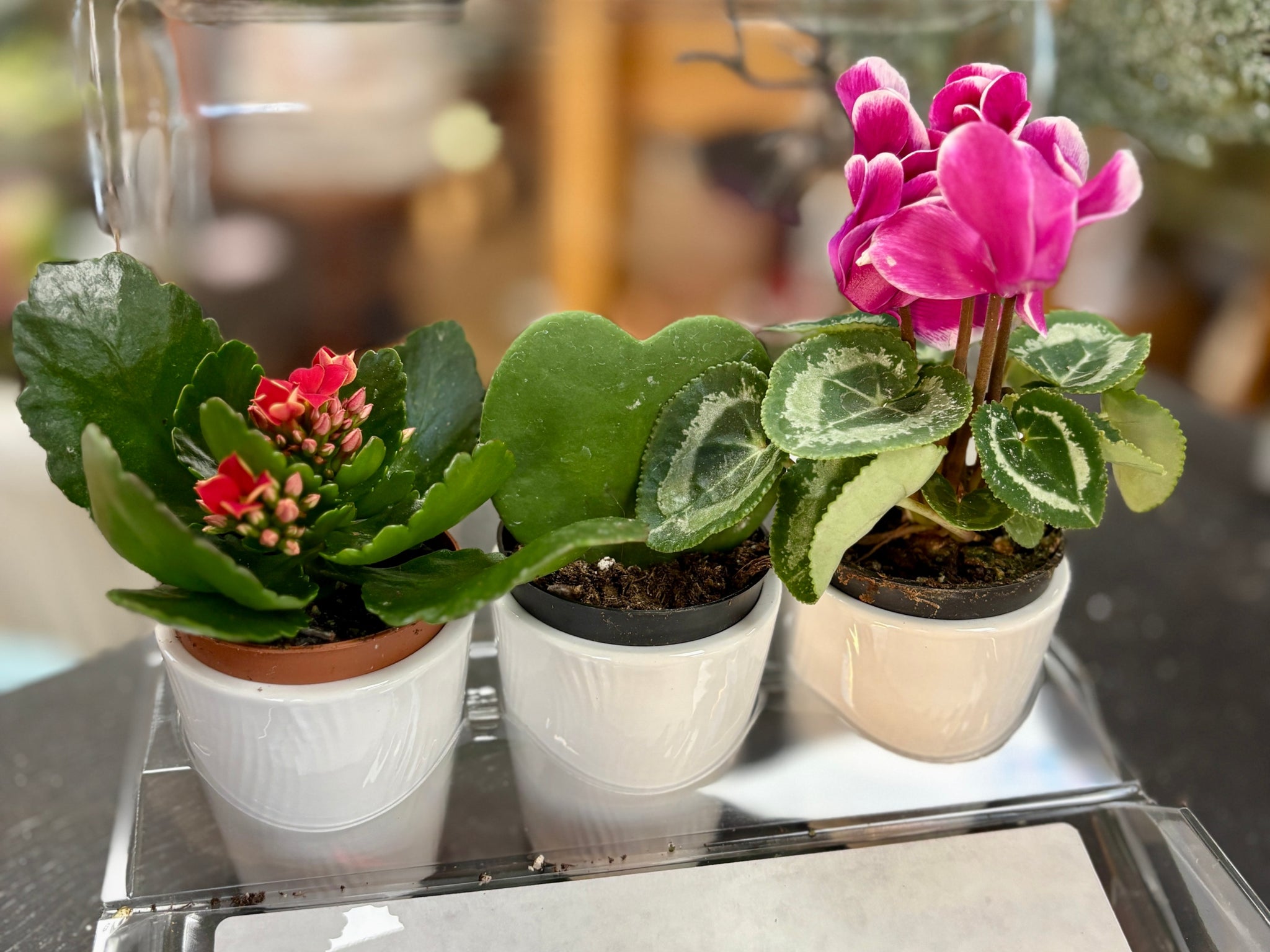 Each mini combo planter includes: One mini kalanchoe plant, one hoya heart plant and one mini cyclamen plant. All plants come in a mini, white ceramic planter. Plastic covered container...