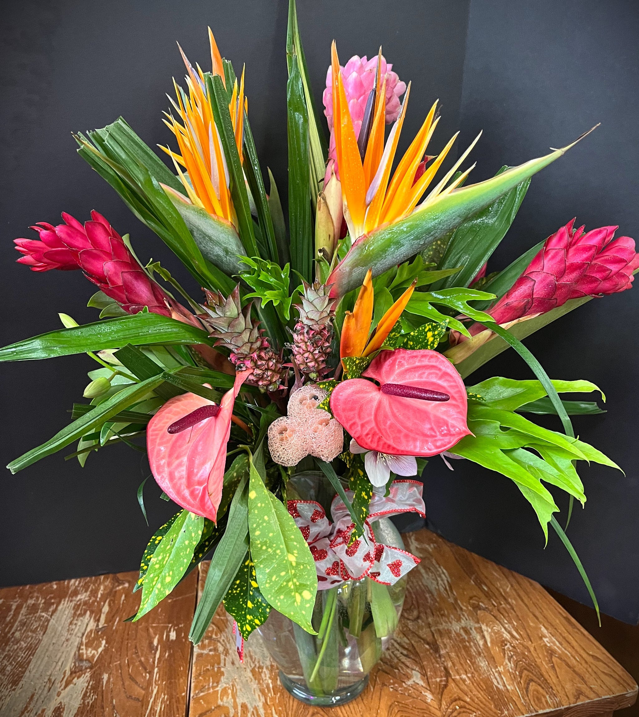 Tropical flowers and greenery are carefully arranged and bouquets may contain assorted protea, birds of paradise, orchids, anthurium, ginger torch, citrus flowers, dried pods, miniature bananas and pineapple. Designer vase is included. Please call us at 319-624-3121 if you're interested in a custom bouquet.