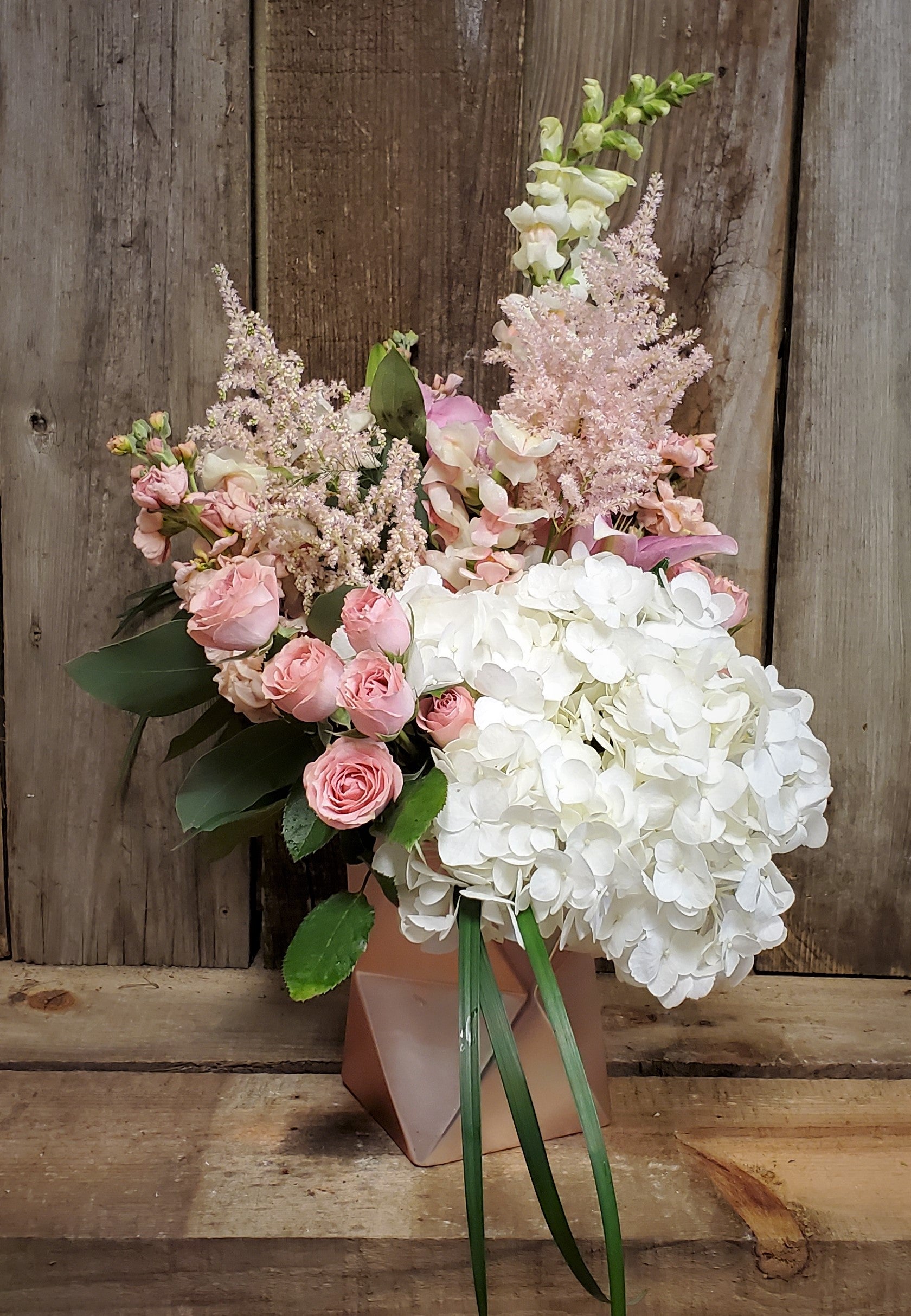 Or choose from our less expensive Fresh Flower Bouquet which contains standard flowers and greenery or our Custom Premium Flower Arrangement if you'd like specific, premium flowers such as hydrangeas, peonies, orchids, Asiatic lilies and premium greenery.