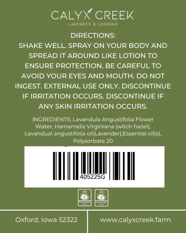 "A luxurious blend of soothing lavender and invigorating eucalyptus essential oils. Perfect for refreshing linens, pillows, and the air around you, this mist is designed for those moments when you crave a little extra calm. Imagine the soft scent of lavender relaxing your senses, balanced with eucalyptus’s cool, clean notes that instantly refresh any room." Calyx Creek Lavender Farm
