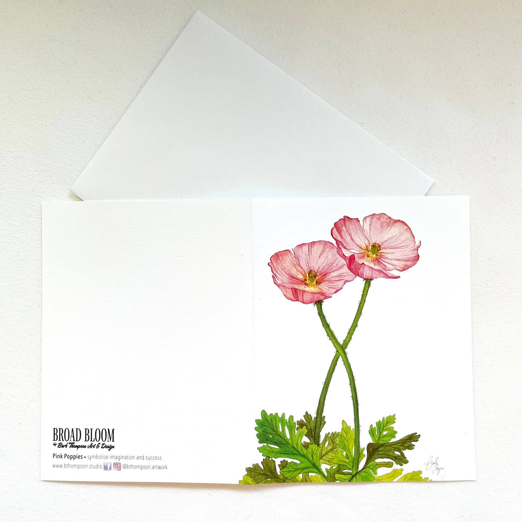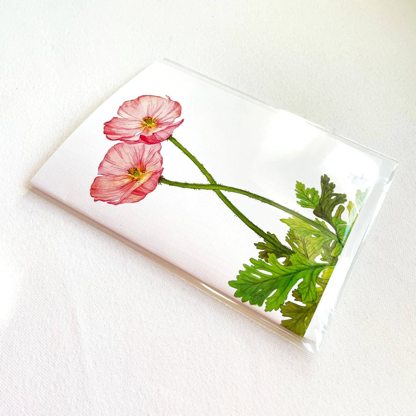 These Midwest printed poppy notecards are blank on the inside, and feature a linen texture. The original watercolor artwork can be seen when the notecard is laid flat. Text on the back of the notecard: "Pink Poppies symbolize imagination and success"