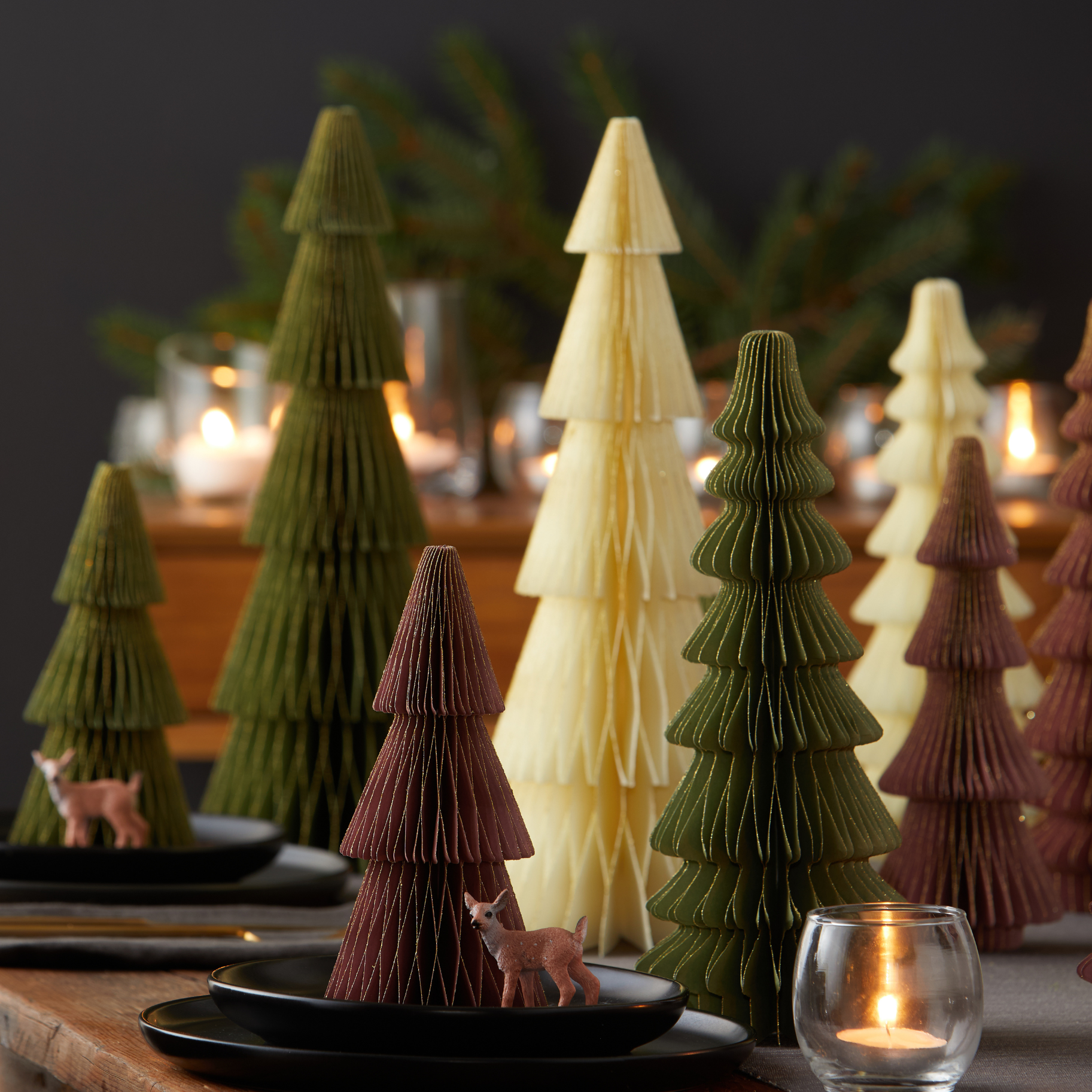 PRODUCT DETAILS: Set of 3 medium trees range from 6.5 inches to 13 inches tall. Set of 5 small includes are 4 inches to 8 inches tall. Large Set of 3 statement-sized trees range in height from 12.5 inches to 19.5 inches tall. Magnets, self-contained within the paper, make these trees sturdy, and easy to assemble. Sets ship flat, are easy to assemble creating a lightweight, sturdy and shapely design. Compact storage offers ease of use year after year.