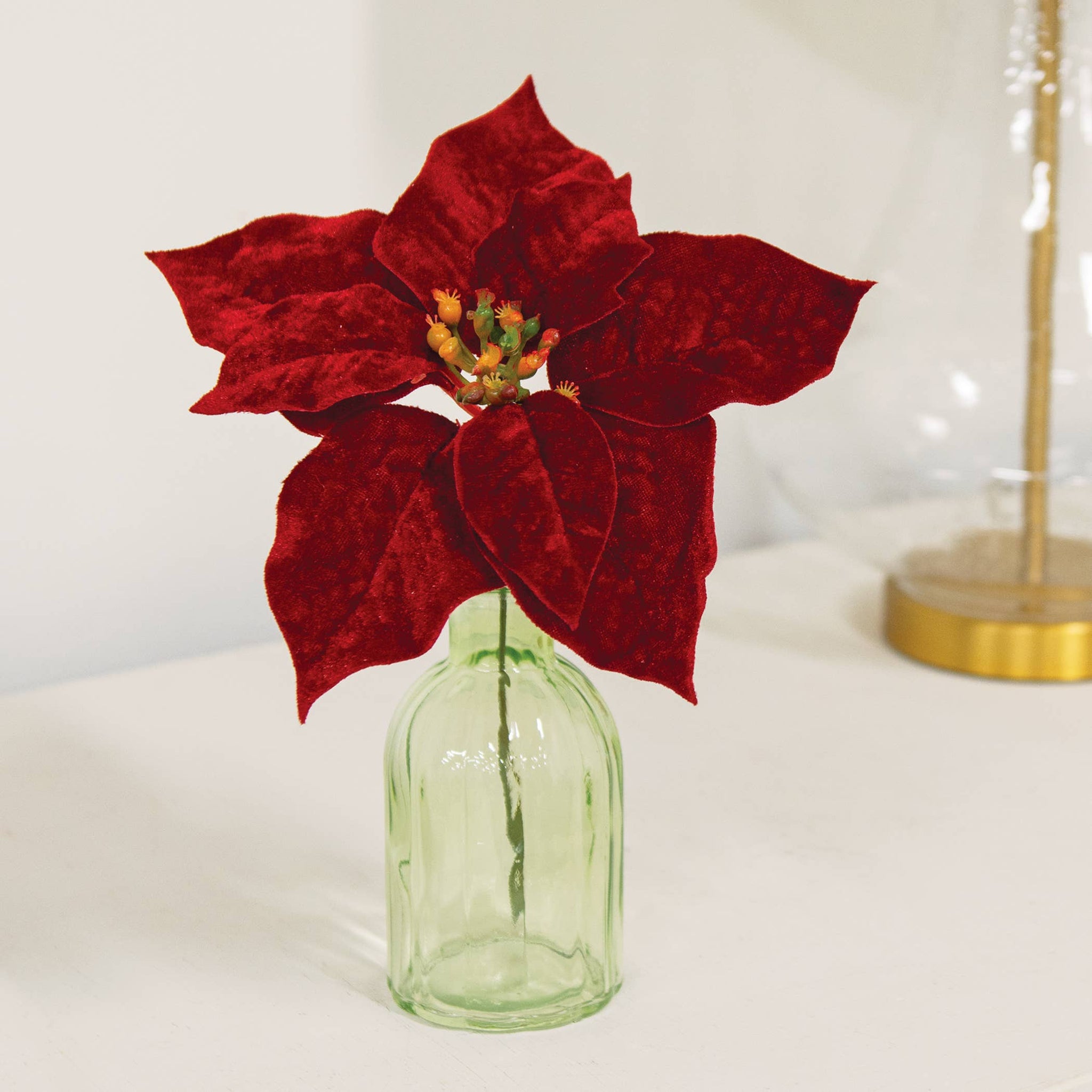 The Winter Party Velvet Poinsettia Pick brings an elegant accent to festive floral arrangements or other displays. A straight green stem allows the pick to easily tuck into a vase with other picks. Rich, red petals with a velvet texture make up the poinsettia. A detailed center starring shades of green and orange completes the pick. Measures 9” high by 7.5” in diameter.